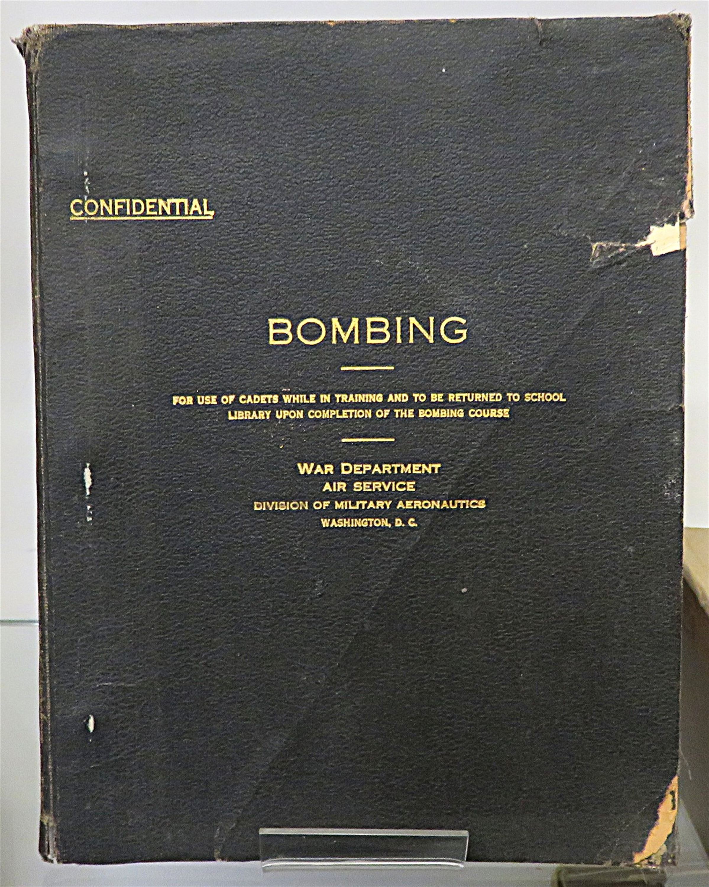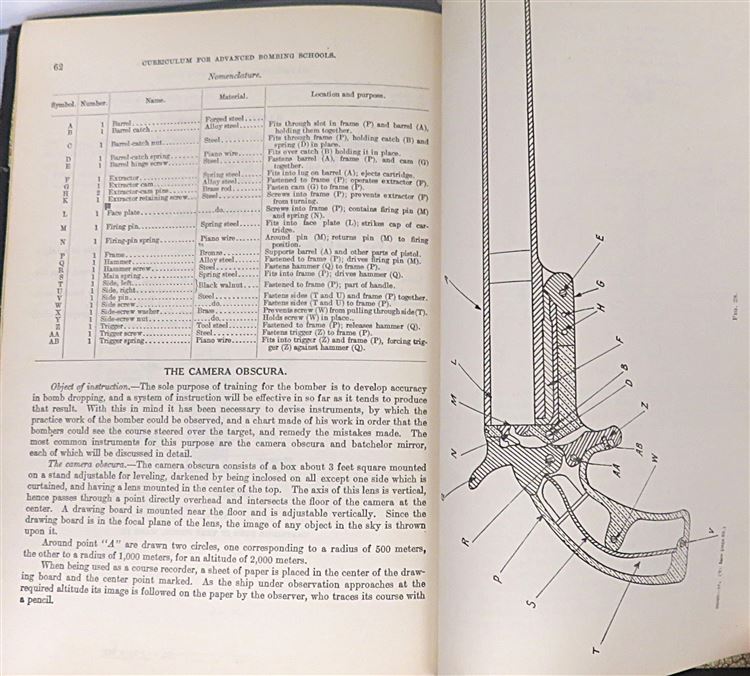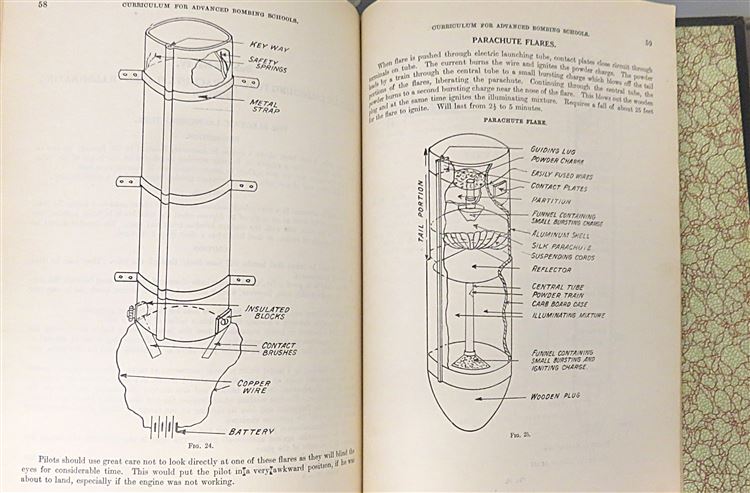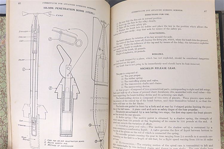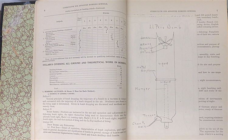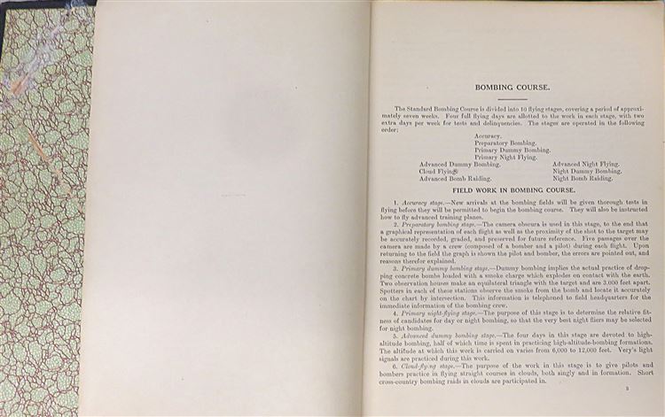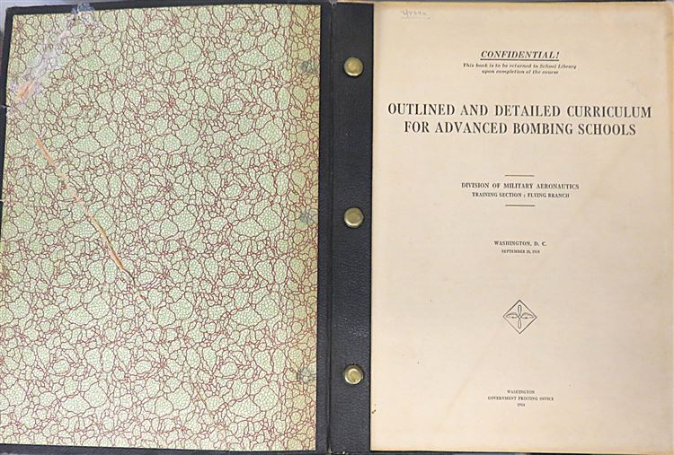 St Mary's Books is proud to present this fascinating slice of history - the 20th September 1918 Confidential "Outlined and Detailed Curriculum for Advanced Bombing Schools" produced by the Training Section: Flying Branch of the US Division of Military Aeronautics. Bound in black cloth with gold gilt lettering, this softcover book contains 89 pages of text, complete with detailed diagrams, tables of information, and insight into contemporary training, intended for the use of cadets completing the bombing course. Inside, one finds information on the 10 flying stages of the course and details of the field work, expectations, and examinations at each stage, alongside some sketches, presumably done by a student. This scarce item is in good condition - there is some significant wear to the cover which has been repaired, however the pages of the text itself remain bright, clean and readable. "Bombing: Outlined and Detailed Curriculum for Advanced Bombing Schools" is looking for a new home, and would be the perfect gift for any aviation collector hoping to preserve this rare artifact.