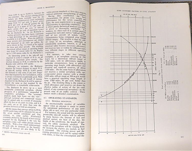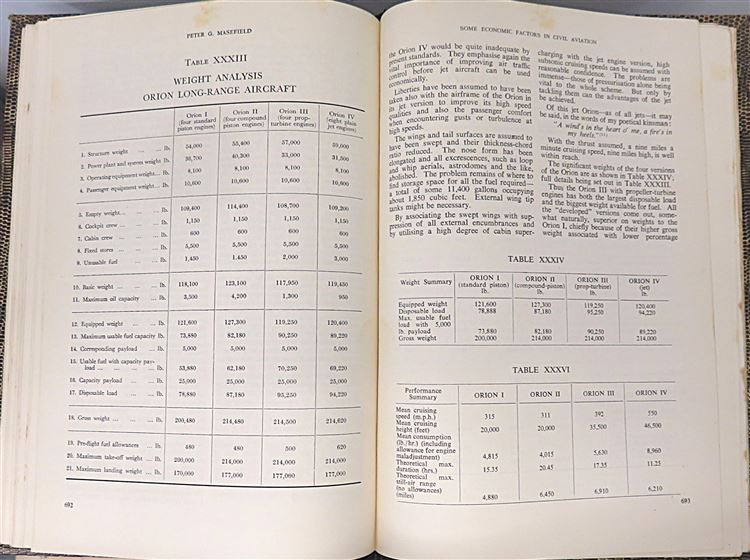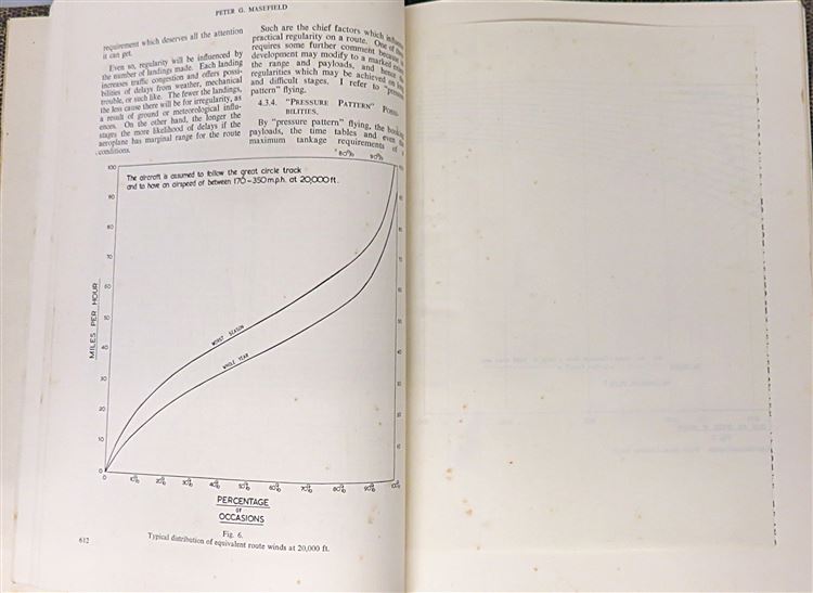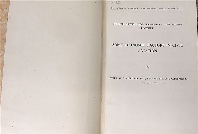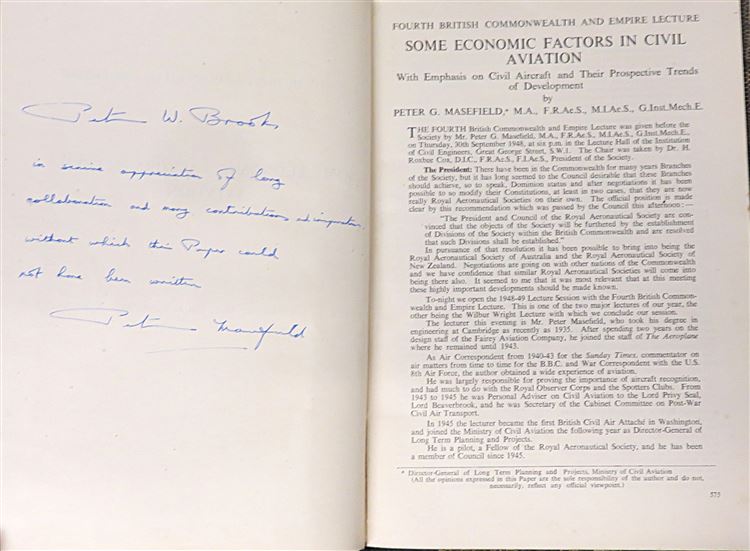St Mary's Books is proud to present this 1948 reprint of the Fourth British Commonwealth and Empire Lecture, "Some Economic Factors in Civil Aviation: With Emphasis on Civil Aircraft and Their Prospective Trends of Development", signed by the author and lecturer, Peter G. Masefield. Bound in beige and black mock snakeskin leather with quarter black leather, this hardback book contains 143 pages of text, supplemented by graphs, diagrams, and further fold-out tables of data at the back of the book. Within the pages of this book, the reader comes to understand the economic prospects of contemporary aeronautical developments and the impact that advancements in long-range transport had on the British Empire. This book is in very good condition, with few notable blemishes other than some very minor bumping to the corners and some slight warping to the boards, the interior remains bright, clean, and readable. "Some Economic Factors in Civil Aviation" is looking for a new home and would make for a perfect gift for any historian of the British Empire.
