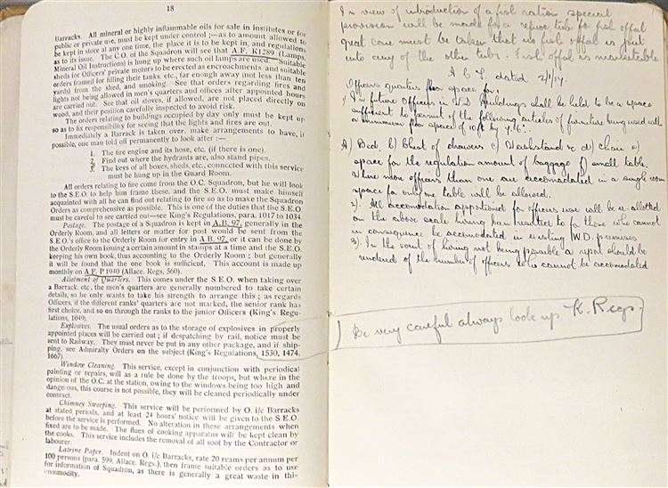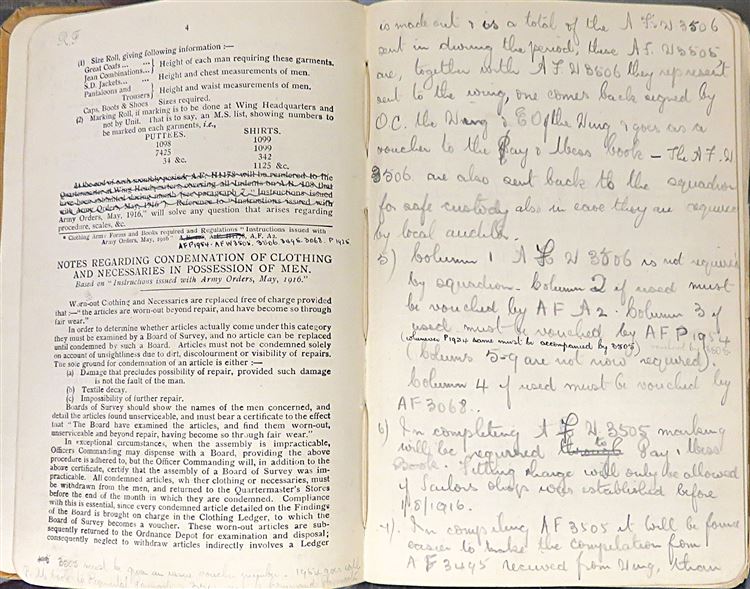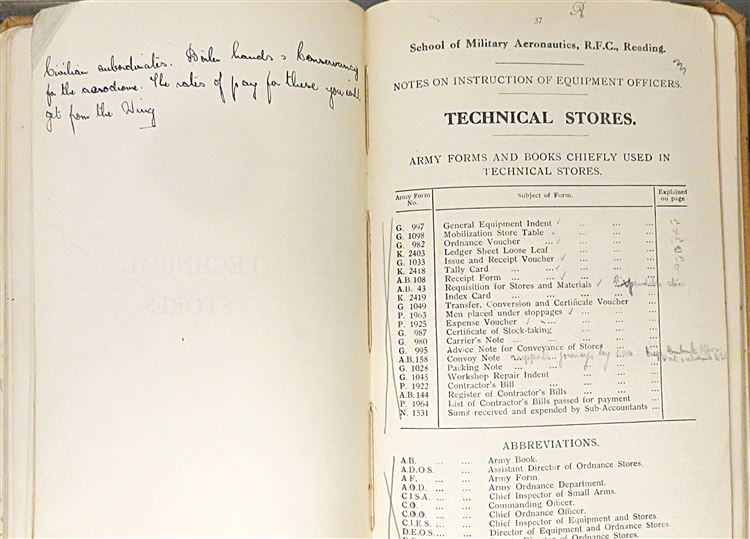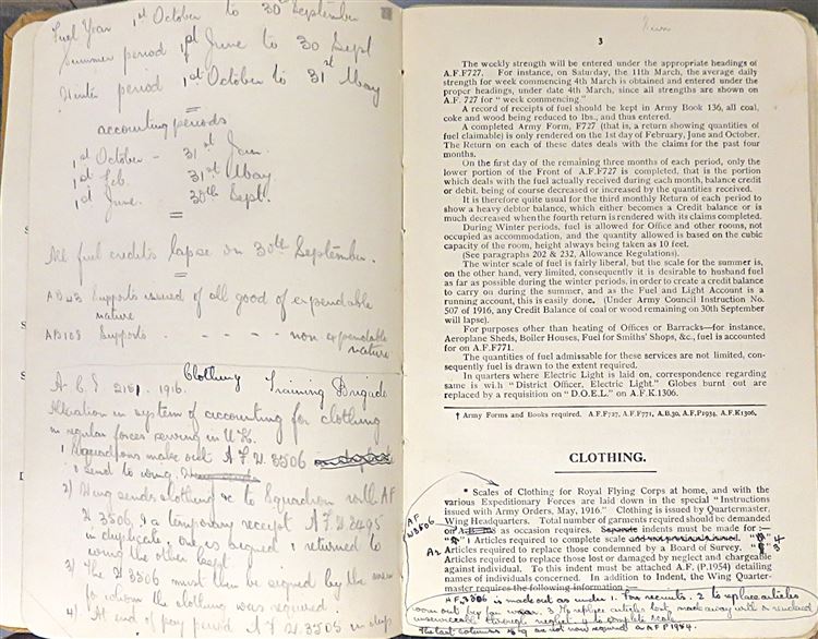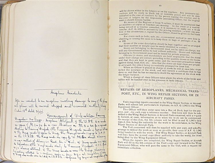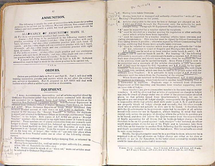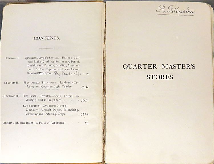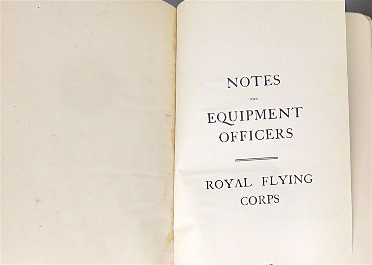 St Mary's Books is proud to present this fascinating slice of history - a Royal Flying Corps "Notes for Equipment of Officers", complete with notes and inscriptions from a previous owner and RFC Officer, R. Fetherston. Bound in light brown cloth with black ink lettering on the cover, this hardback book contains 62 pages of text including fold out diagrams and detailed information that an Officer of the Royal Flying Corps would need to be familiar with. What makes this item particularly intriguing, though, is the large amount of pencil inscriptions, filling almost every blank page, as well as the included documents "Quartermasters' Stores" and further handwritten notes. These notes, alongside the writers doodles on the back free endpaper, truly humanise the Officers of the Great War for any observer. This book is in good condition - the cover is bumped and worn, there is some splitting at the hinges, and pages 10-12 are loose. However, it remains remarkable in itself that this truly scarce item has survived. "Notes for Equipment of Officers" is looking for a new home where it will be similarly appreciated and preserved.