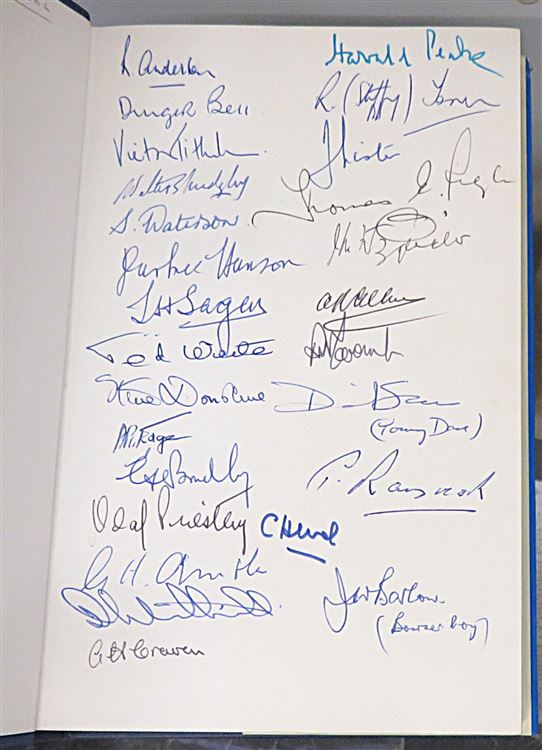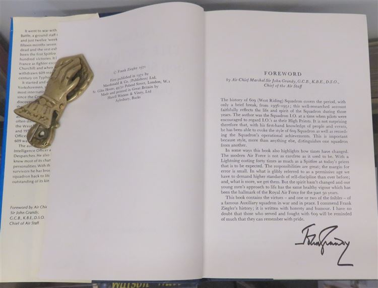 This 1971 First Edition book provides a detailed and personal look at one of the most distinguished auxiliary squadrons of the Second World War. Frank Ziegler draws heavily from his own experiences and the squadron's oficial diaries to create a narrative that focuses on the people, both the pilots and the crew, rather than combat reports. This copy has been signed by several members of the squadron, to the front free endpaper. The dust jacket is unclipped, however worn to the extremities. There are the remains of a small sticker to the front. Underneath lie navy cloth boards which despite a little bumping are in very good condition. The pages within are clean and illustrated with several black and white photographic plates. pp. 352.