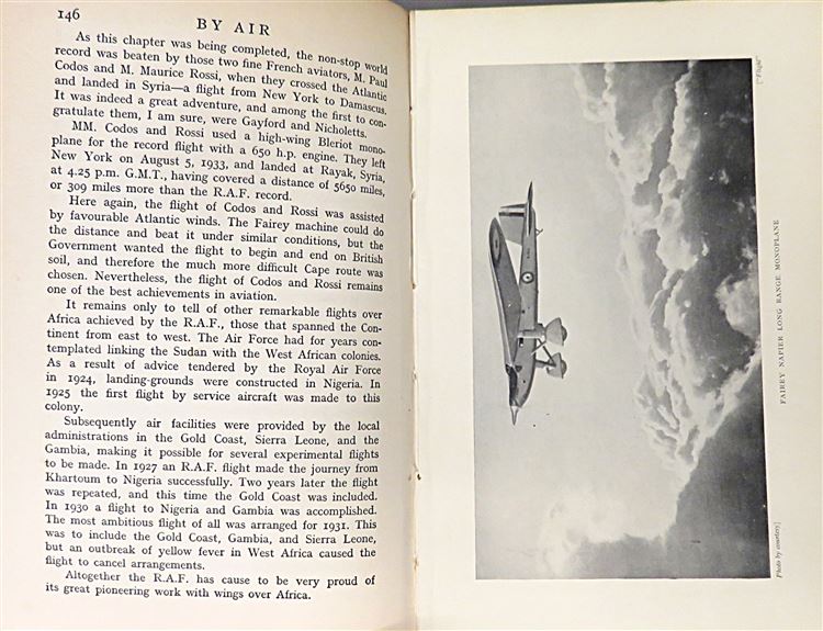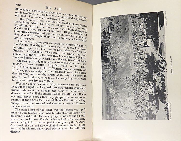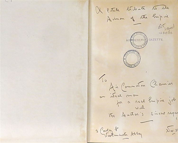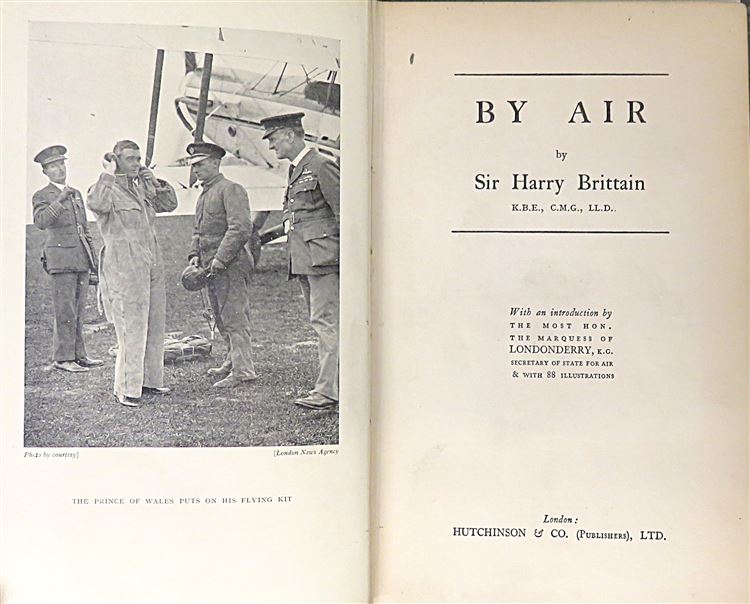 St Mary's Books is proud to present this 1933 first edition of "By Air", signed and inscribed by the author Sir Harry Brittain, describing the book as "an elite tribute to the Airmen of the Empire" and dedicating it to "Air Commodore Chamier, an ideal man for a real Empire job". Bound in black cloth with gold gilt lettering to the spine, this hardback book contains i-xiv and 294 pages of text, peppered with black and white photographs. Within the pages of this book, the reader is treated to a record of the intense development and real achieements of civil aviation in Britain using primary sources and contemporary records. This copy is in good condition - there is some slight damage to the cloth on the spine, some minor offsetting on the front free endpaper, and it appears some of the images are missing and have been replaced with facsimilies. "By Air" is looking for a new home and would make for a perfect gift for any aviation enthusiast.