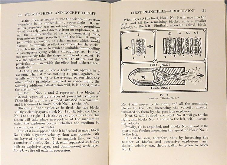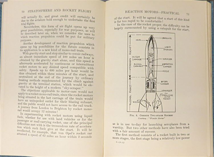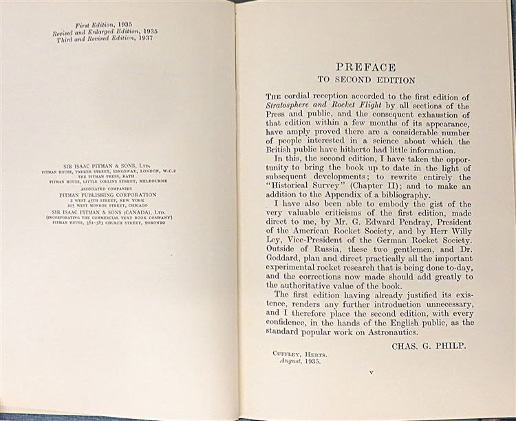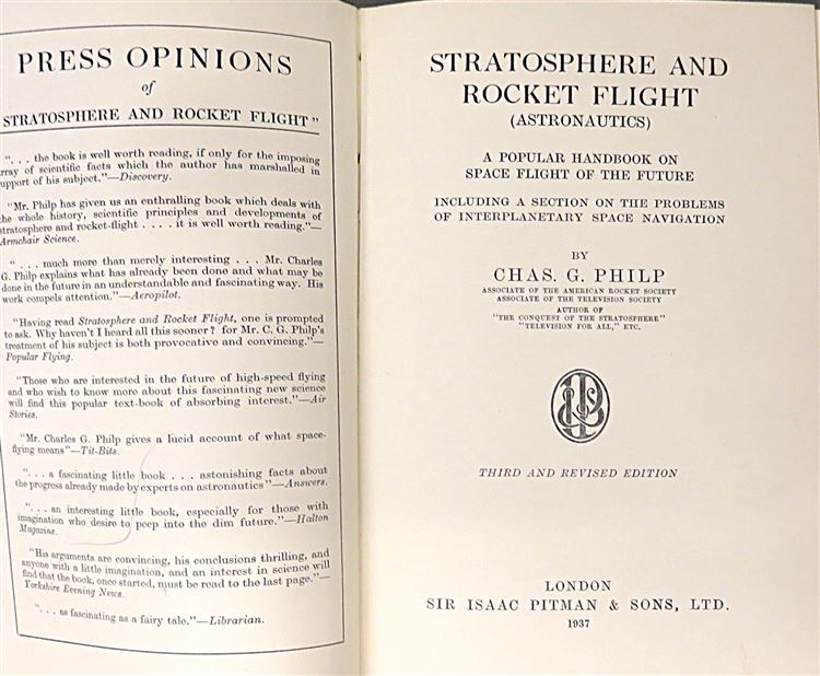 St Mary's Books is proud to present this 1937 third and revised edition of "Stratosphere and Rocket Flight (Astronautics): A Popular Handbook on Space Flight of the Future" by Chas. G. Philip. Housed in its original blue dustjacket featuring a black and white illustration of the rockets of the future, this hardback book is bound in blue cloth with black ink lettering on the cover and spine. Inside, one finds i-ix, 126pp. and 4 pages of advertisements to the back of the book. Within the pages of this book, the reader is treated to the insight from the first book in the UK published on astronautics, described in an understandable and fascinating manner by Chas. G. Philip. This copy is in very good condition - though the original dustjacket can only be described as fair to good as it has suffered significant losses and damage, the book itself remains well-preserved, with only some minor offsetting on the front free endpaper to report, the interior remains bright, clean, and readable. "Stratosphere and Rocket Flight" is looking for a new home and would make for a perfect gift for any aviation enthusiast.
