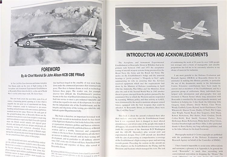 St Mary's Books is proud to present this 2001 first edition of "The Cold War Years: Flight Testing at Boscombe Down 1945-1975" by Tim Mason, the sequel to hsis earlier work onj aeroplane and armament experimental establishment in the Second World War. Housed in its original grey dustjacket featuring a full-colour illustration of an aeroplane, this hardback book is bound in burgundy cloth with gold gilt lettering to the spine. Inside, one finds 336 pages of text, peppered with wonderful black and white aerial photography, and details the beginning of the end of the piston-engine era an the dawn of the jet age into the Cold War Years, informed by material that the Ministry of Defense has specially cleared for this edition. This copy, and its original dustjacket are in very good condition - with few notable blemishes or imperfections it appears virtually as-new. "The Cold War Years: Flight Testing at Boscombe Down 1945-1975" is looking for a new home and would make for the perfect gift for any aviation enthusiast.