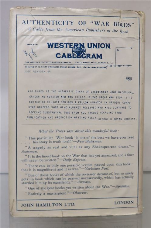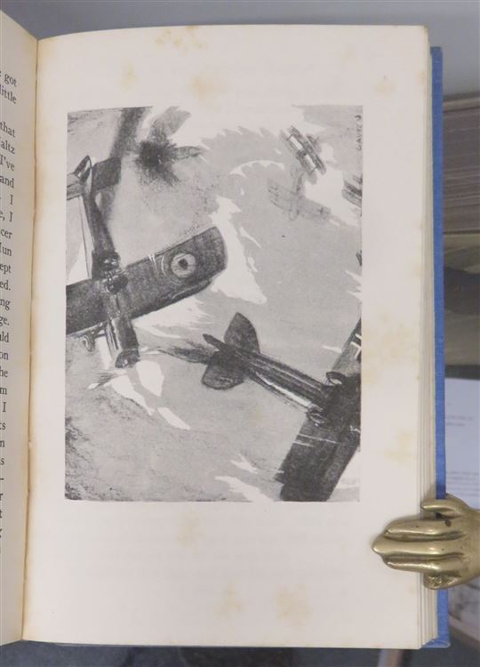 Originally published anonymously, one of the authors of this book was a controversial industrialist by the name Elliott Springs, who wrote aviation books as a hobby. They were only printed in limited quantities and today are very difficult to find. This book is the edited diary of the other author, John MacGavock Grider, and follows his time as an American pilot during the First World War before his death in combat, being shot down behind the German lines. This lovely edition is the 7th reprint, bound in blue cloth with a gilt illustration on the front cover and gilt lettering to the spine. In the front of the book is attached a piece of paper indicating that this book was previously a part of a private collection. It is beautifully illustrated throughout with black and white drawings. Overall, this book is in very good condition. There is some very slight foxing to the pages throughout and the textblock, but otherwise the pages are clean and bright. The gilt on the covers has remained bright, despite some fading to the spine. the dust jacket is in good condition. There is some wear to the edges and corners. pp. 277.