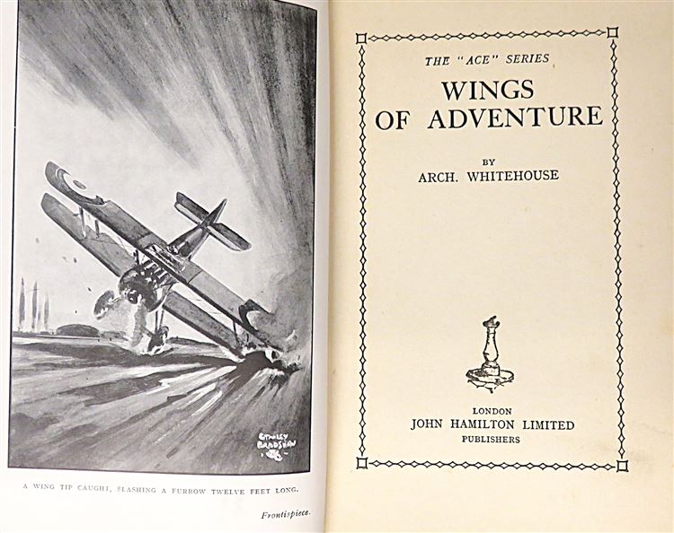 This lovely early edition of "Wings of Adventure" by Arch. Whitehouse with illustrations by Stanley Orton Bradshaw is housed in its original pictorial dustjacket featuring a stunning illustration of an aeroplane soaring through the mountains. Bound in green cloth with black ink lettering on the spine, this hardback book contains i-vi and 222 pages of text peppered with further stunning black and white illustrations. Within the pages of this book, the reader is treated to Arch Whitehouse's thrilling aviation adventures from the cold Alaskan seas to Java. This copy is in very good condition. Though it's original dustjacket can only be described as good due to some significant bumps and tears, the book itself remains well preserved. "Wings of Adventure" is looking for a new home and would make for the perfect gift for any aviation enthusiast.