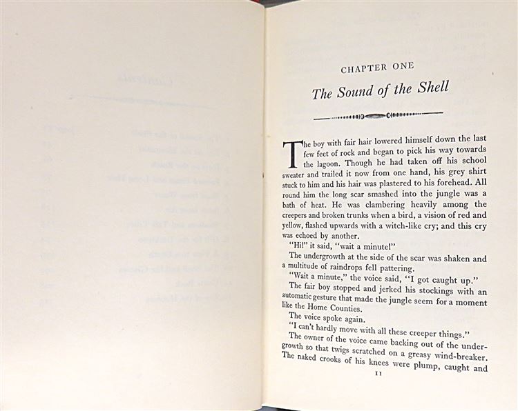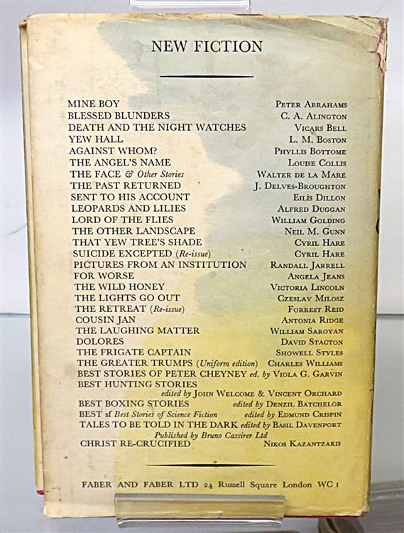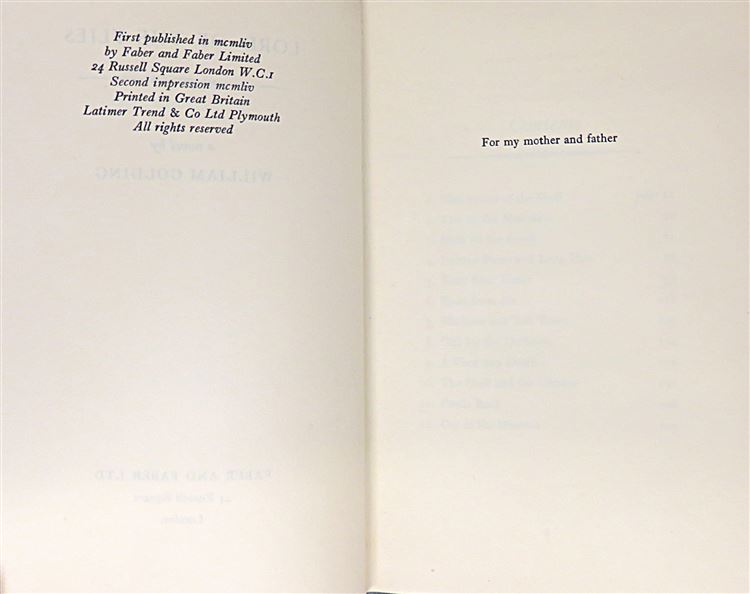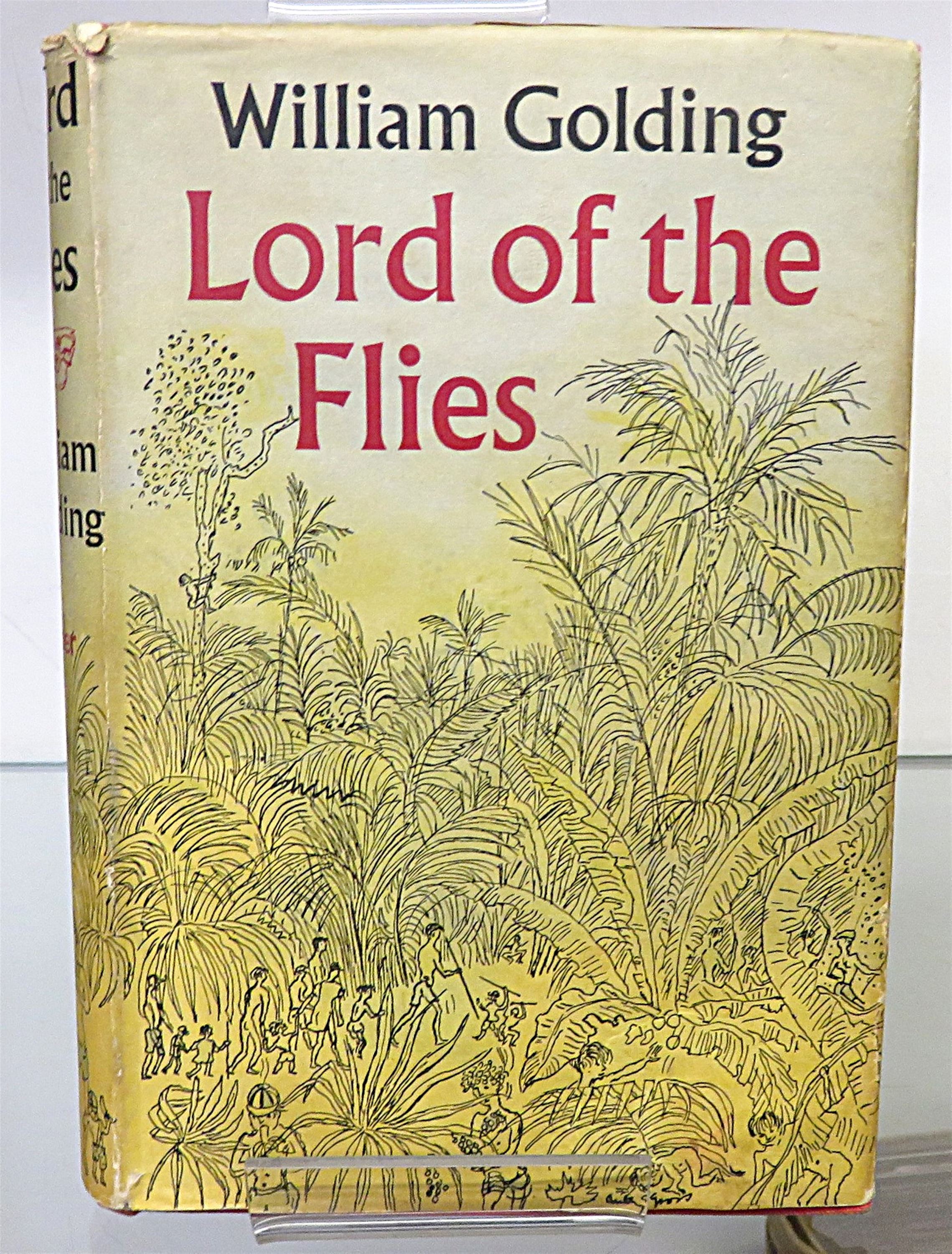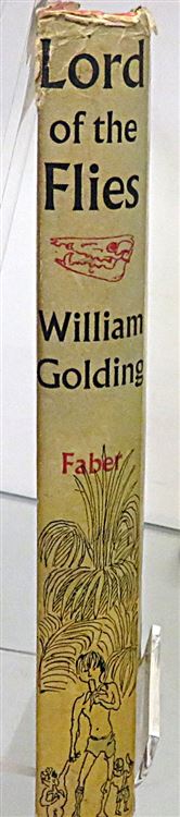 St Mary's Books is proud to present this incredibly well-preserved 1954 first edition second impression of "Lord of the Flies" by William Golding. Housed in its original pictorial dustjacket featuring a charming black ink illustration of the boys trekking through the jungle, this hardback book is bound in crimson cloth with white ink lettering to the spine, with 248 pages of text. Within the pages of this book, the reader is treated to this classic yet harrowing tale of unsupervised schoolboys and their various attempts to establish a civilised society before their descent into violence and chaos. This copy, and its original dustjacket, are in very good condition. Other than a small pen inscripton on the front free endpaper, the interior of the book appears remarkably bright, clean, and readable - seemingly untouched. The dustjacket has some very minor bumps to the edges but otherwise appears well-preserved. Finally, there is a slight lean to the spine. This 1954 first edition second impression of "Lord of the Flies" by William Golding is looking for a new home where it will be similarly cared for and appreciated.