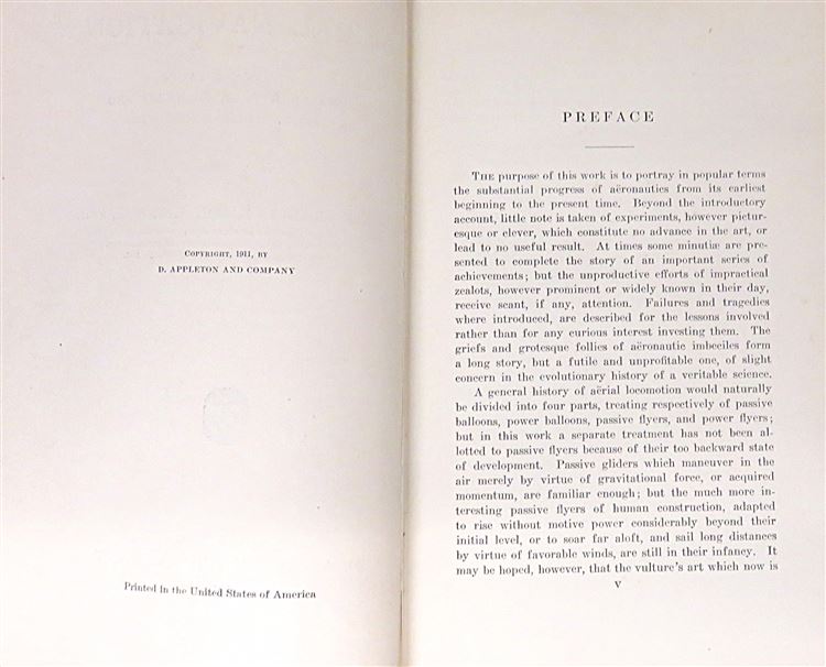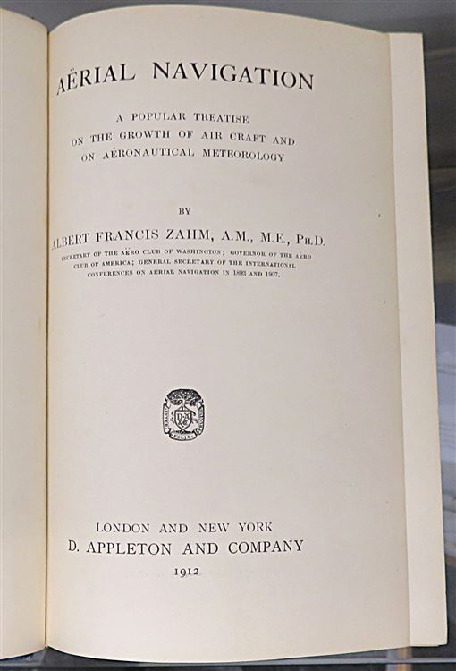 Hardback, published in 1912, This copy is in very good condition. Bound in the publisher's original blue cloth with bright gilt titles and small decal in white to the front and spine. Superbly illustrated with several diagrams, photographic plates and a map. Our copy shows a little bumping to the spine although overall the binding presents well. the text block is tight and the pages within are very clean. pp. xvi + 497. A scientific treatise from the author Albert Francis Zahm, serving as a comprehensive history and technical study of aeronautics, intended to bridge the gap between complex science and popular understanding during the early days of aviation.