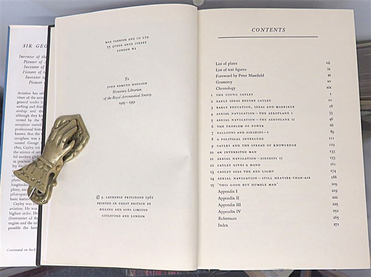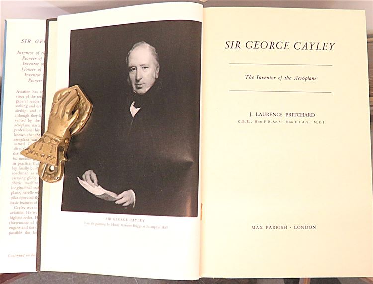 A 1961 First Edition copy. Widely acknowledged as the "Father of Aviation" his life and contributions are detailed in this definitive biography by J. Laurence Pritchard. Sir George Cayley was the first to seperate the concept of lift from propulsion, moving away from the idea of flapping wings to fixed wings designs. This copy is complete with its dust jacket. The dust jacket shows a little edge wear while underneath the black cloth boards are in very good condition. Ex-libris and presentation label to the front endpapers otherwise a very good clean copy. Illustrated with several diagrams and photographic plates. pp. xviii + 277. A very good addition to any aviation library.