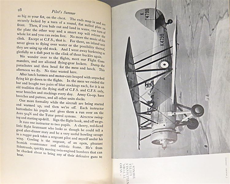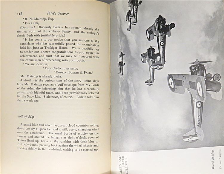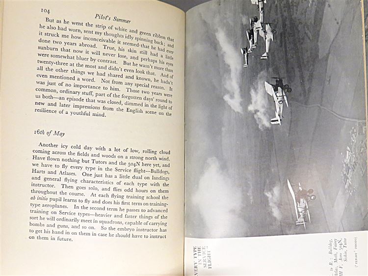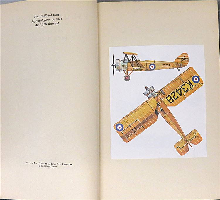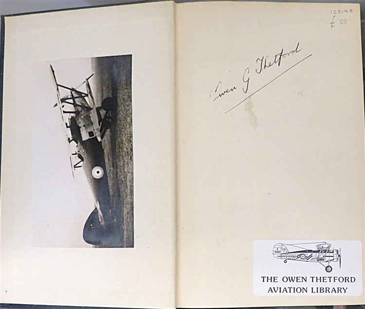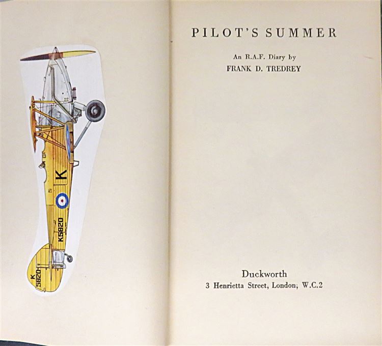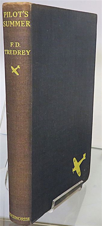 St Mary's Books is proud to present this 1941 reprint of "Pilot's Summer: a diary of three months in the R.A.F." by F. D. Tredrey, signed by fellow aviation author Owen G. Thetford. Housed in its original blue dustjacket with a black and white photograph featuring aeroplanes in flight, this hardback book is bound in navy cloth with a brown cloth spine featuring yellow ink lettering. Inside, one finds 236 pages of text peppered with similarly stunning aerial photography. Within the pages of this book, the reader is treated to thrilling descriptions of flying maneouvres, and intimate day-by-day detail of a three month course at the Central Flying School. This book is in good condtition - the cloth on the spine is worn, there is an "Owen Thetford Aviation Library" paste-down on the free endpaper, as well as an aviation photograph paste down on the free endpaper, and a further aviation illustration paste-down on the frontispiece page. In addition, the dustjacket has suffered significant damage and thus can only be described as fair. "Pilot's Summer" is looking for a new home and would make for a perfect gift for any aviation enthusiast.